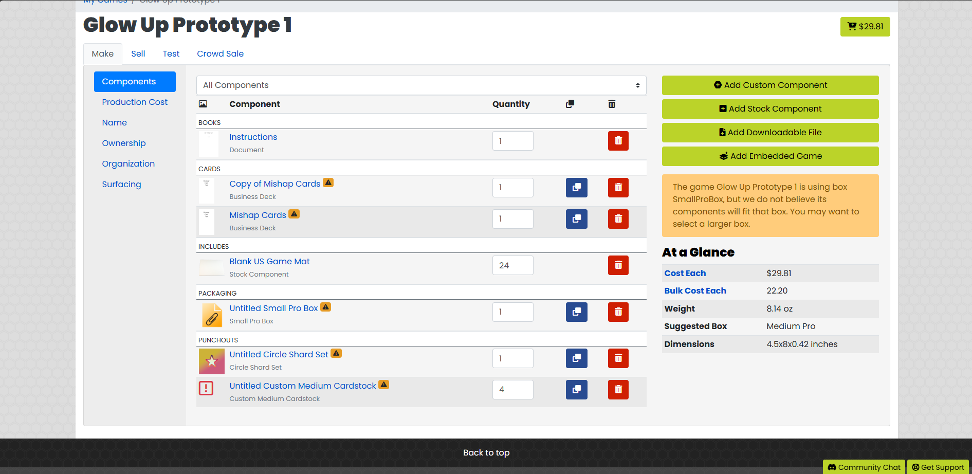 Currently, we have everything we need in GameCrafter for $29.81 under our $30 budget. With this, we will move our focus toward designing each component, getting the game ready to be printed.